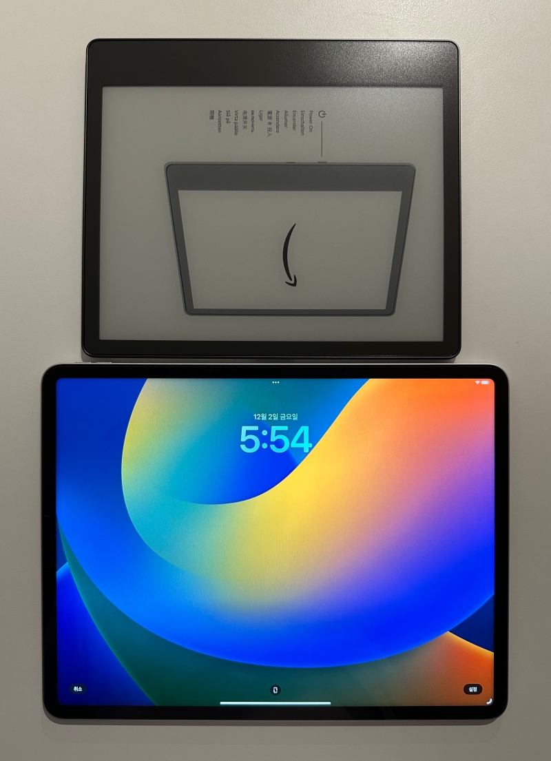 킨들 스크라이브와 아이패드 프로의 크기 비교입니다.